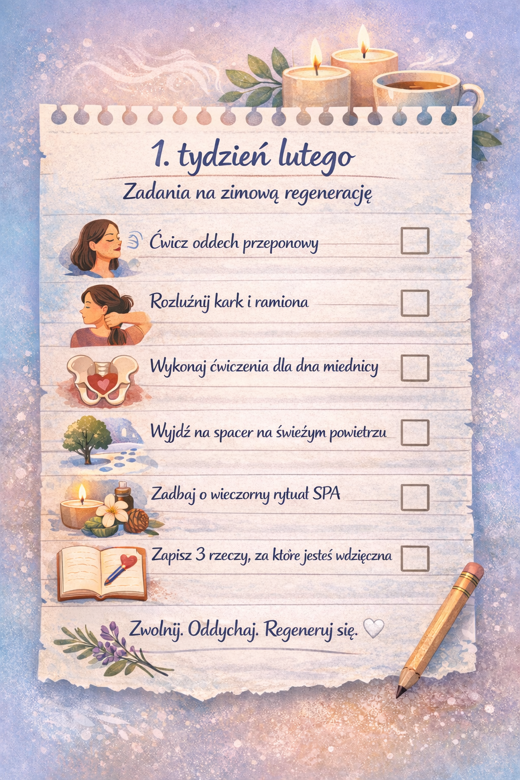 Przygotowałam dla ciebie grafikę, taką checklistę „Zadania na zimową regenerację” (1. tydzień lutego), opartą na zasadach fizjoterapii, pracy z oddechem i świadomej regeneracji.